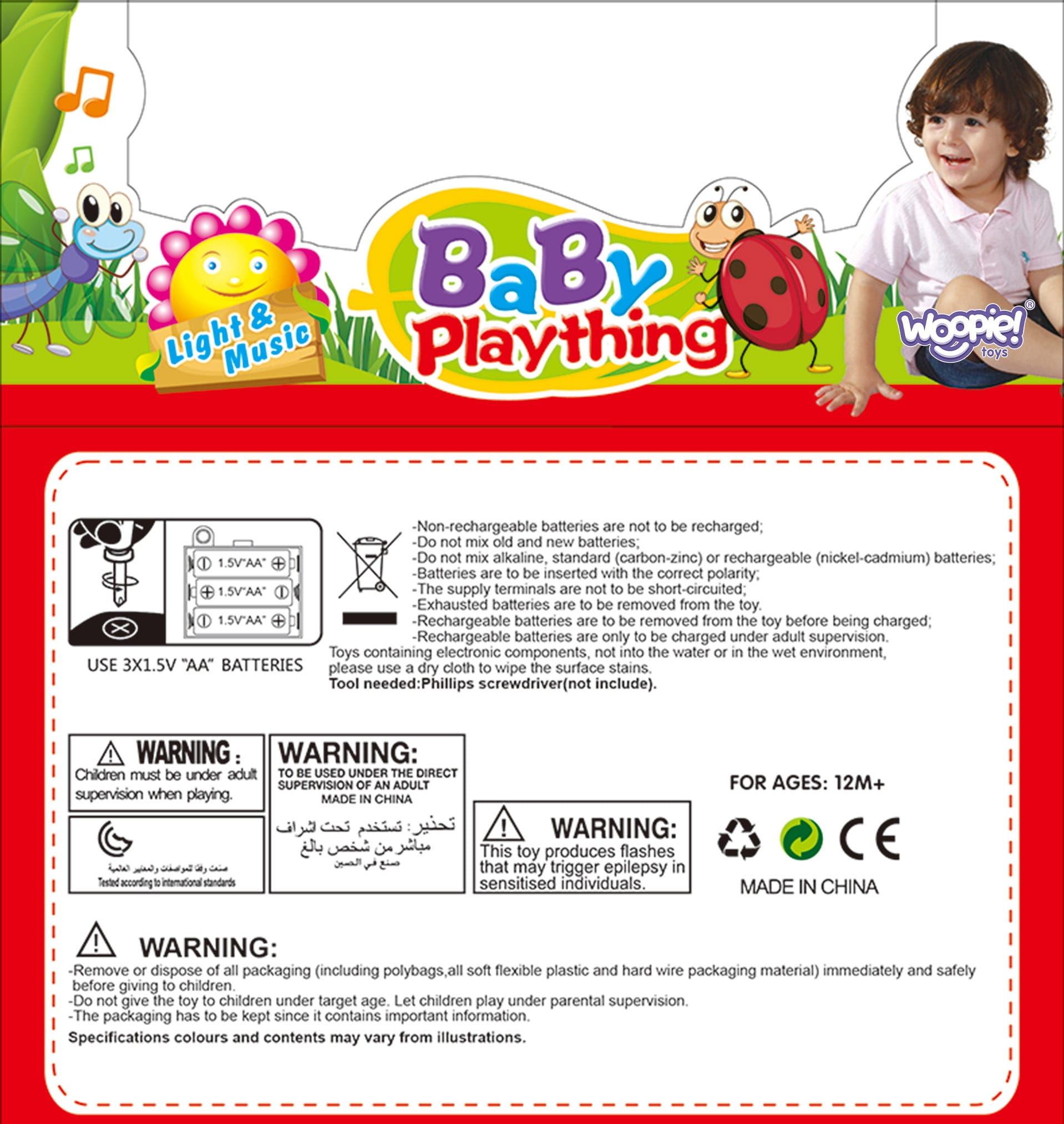 Zabawka interaktywna do raczkowania Biedronka od marki WOOPIE jest świetnym narzędziem do nauki pierwszych kroków. Zabawka jeździ i ucieka maluszkowi, by ten chciał zacząć się ruszać i ją złapać. Specjalny czujnik pozwoli Biedronce wyczuć przeszkodę i obrócić się w drugą stronę. Biedronka posiada liczne wartości edukacyjne. Każda nóżka posiada inny kolor i inne zwierzę do nauki z dzieckiem. Dodatkowo po naciśnięciu na nóżkę usłyszymy nazwę zwierzęcia i dźwięk z nim związany. Nazwy zwierząt są w języku angielskim co pozwoli dziecku przyswoić pierwsze słówka. Efekty świetlne i dźwiękowe następują po uderzeniu bębenka na górze zabawki. Zabawka rozwija dziecko od najmłodszych lat m.in. poprawia koncentrację, koordynację ręka-oko oraz umiejętności poznawcze.