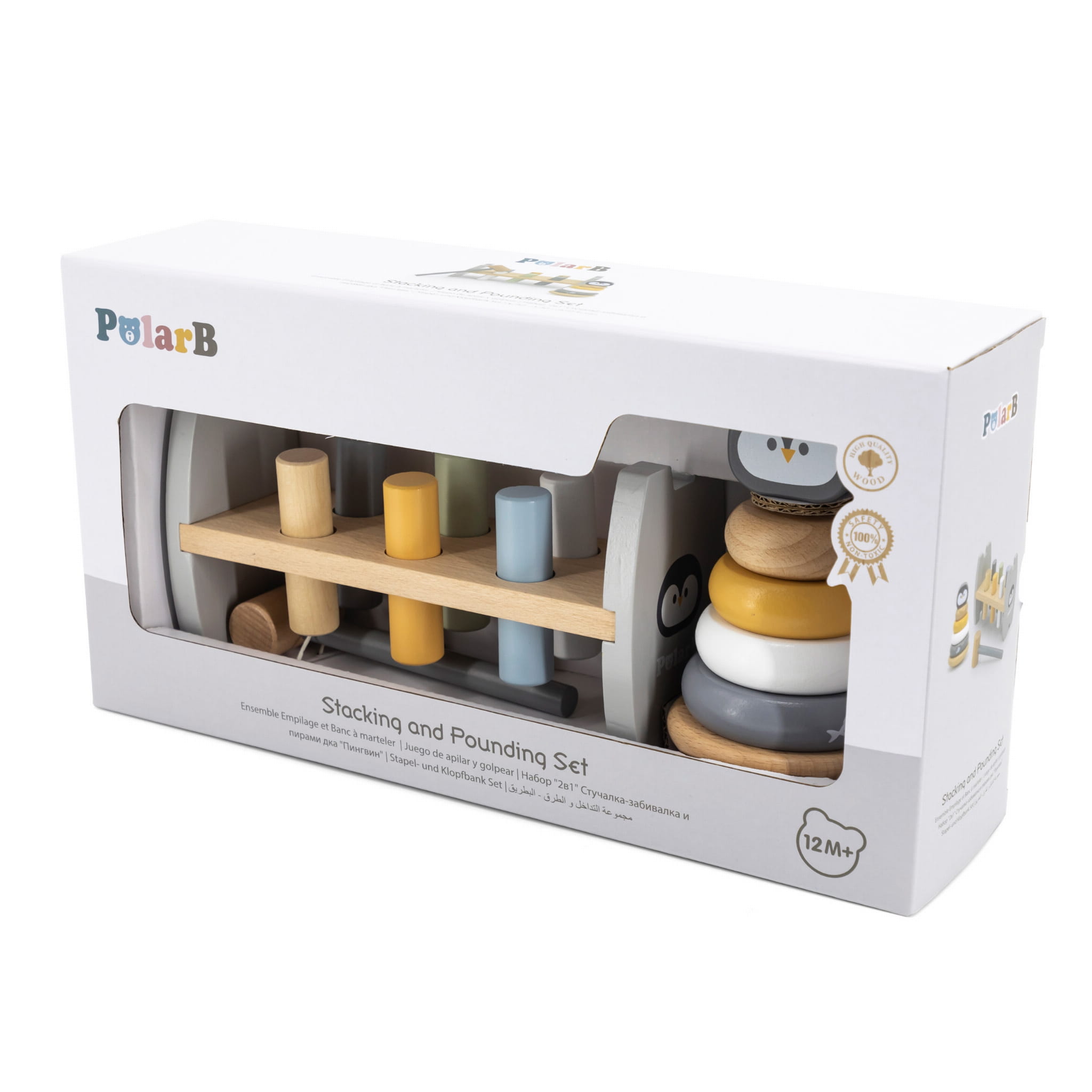 W tym zestawie z serii PolarB od marki Viga znajdziemy dwie pastelowe, drewniane zabawki: piramidkę edukacyjną oraz przebijak z młoteczkiem. Obie zabawki nie tylko wypełnią czas dziecka świetną zabawą, ale przyczynią się do rozwoju zdolności motorycznych, logicznego myślenia oraz nauki kolorów. Dzięki spędzaniu czasu z tymi zabawkami dziecko nabędzie precyzję ruchów rączek, która w przyszłości ułatwi naukę pisania.