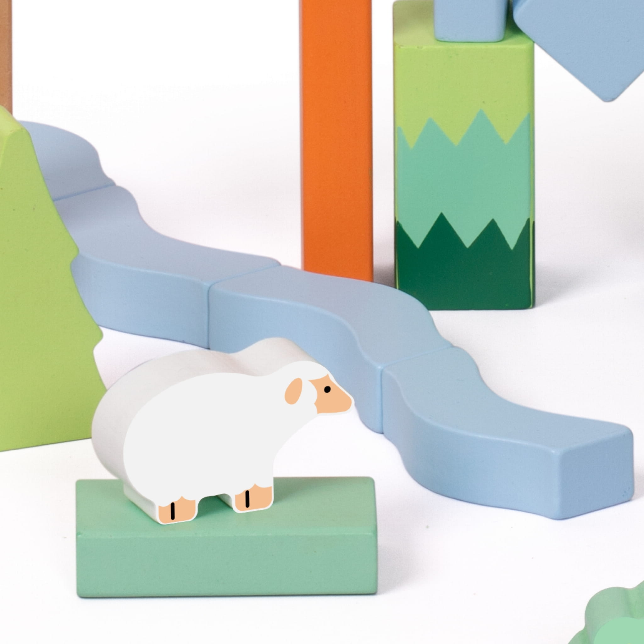 Klocki przedstawiają drzewa, zwierzęta i elementy krajobrazu