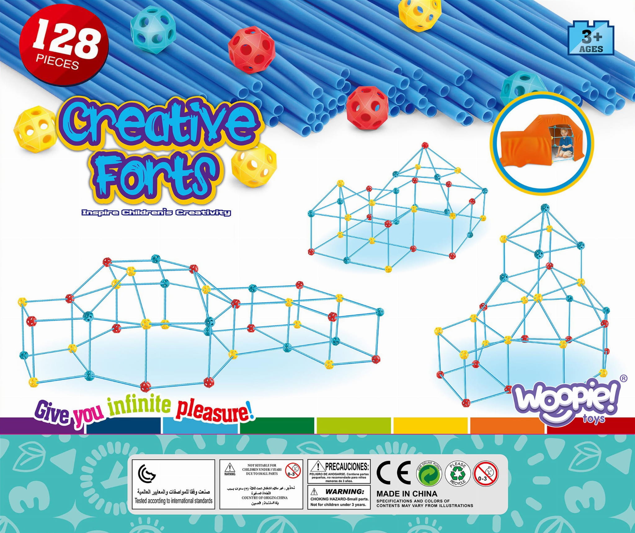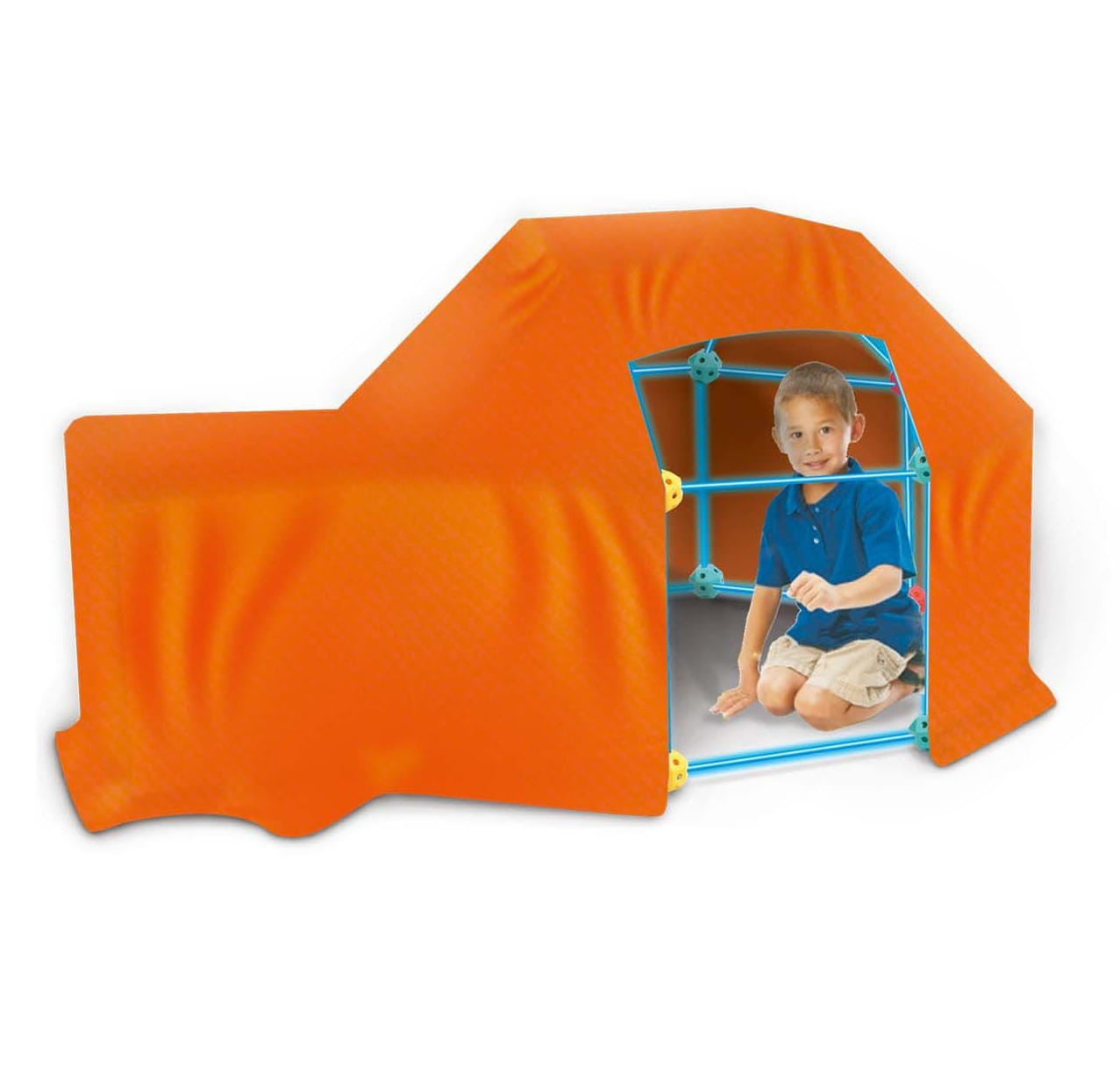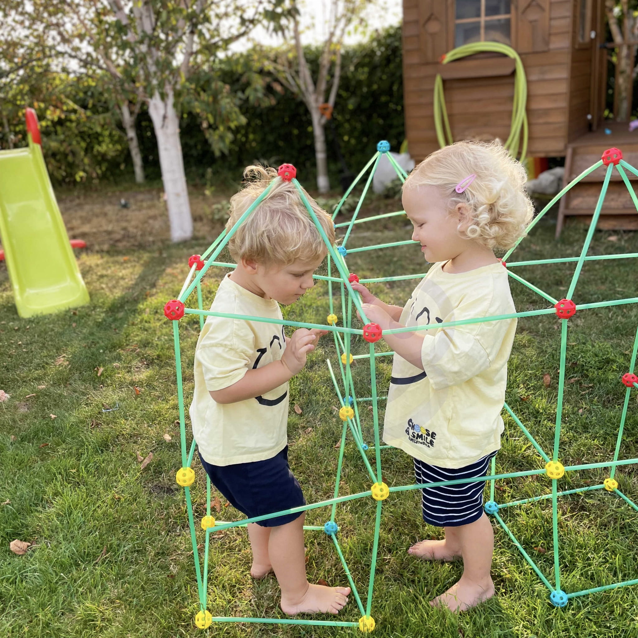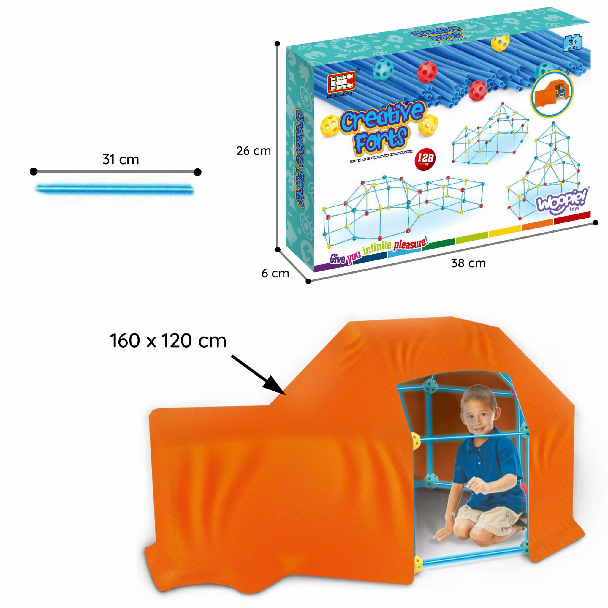 Kreatywny zestaw do budowy namiotów i tuneli – 128 elementów, w tym rurki, łączniki i materiał. Dla małych konstruktorów od 3 lat.