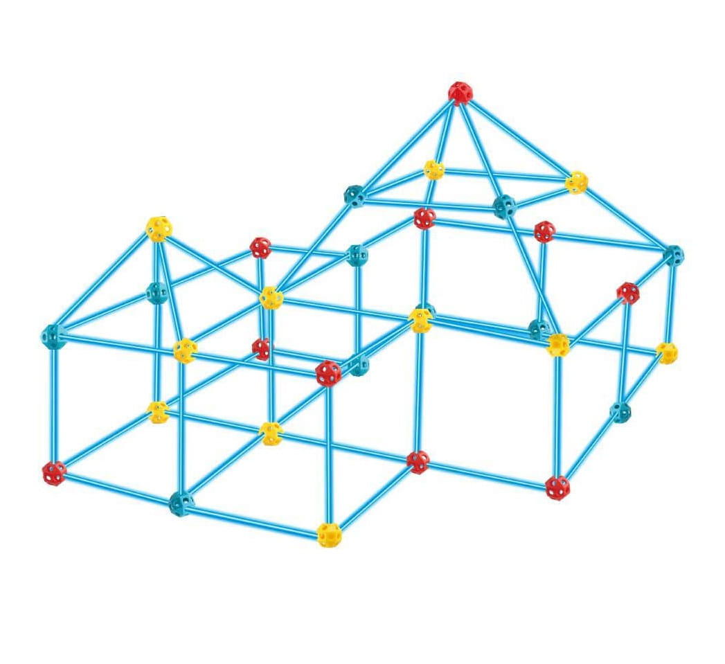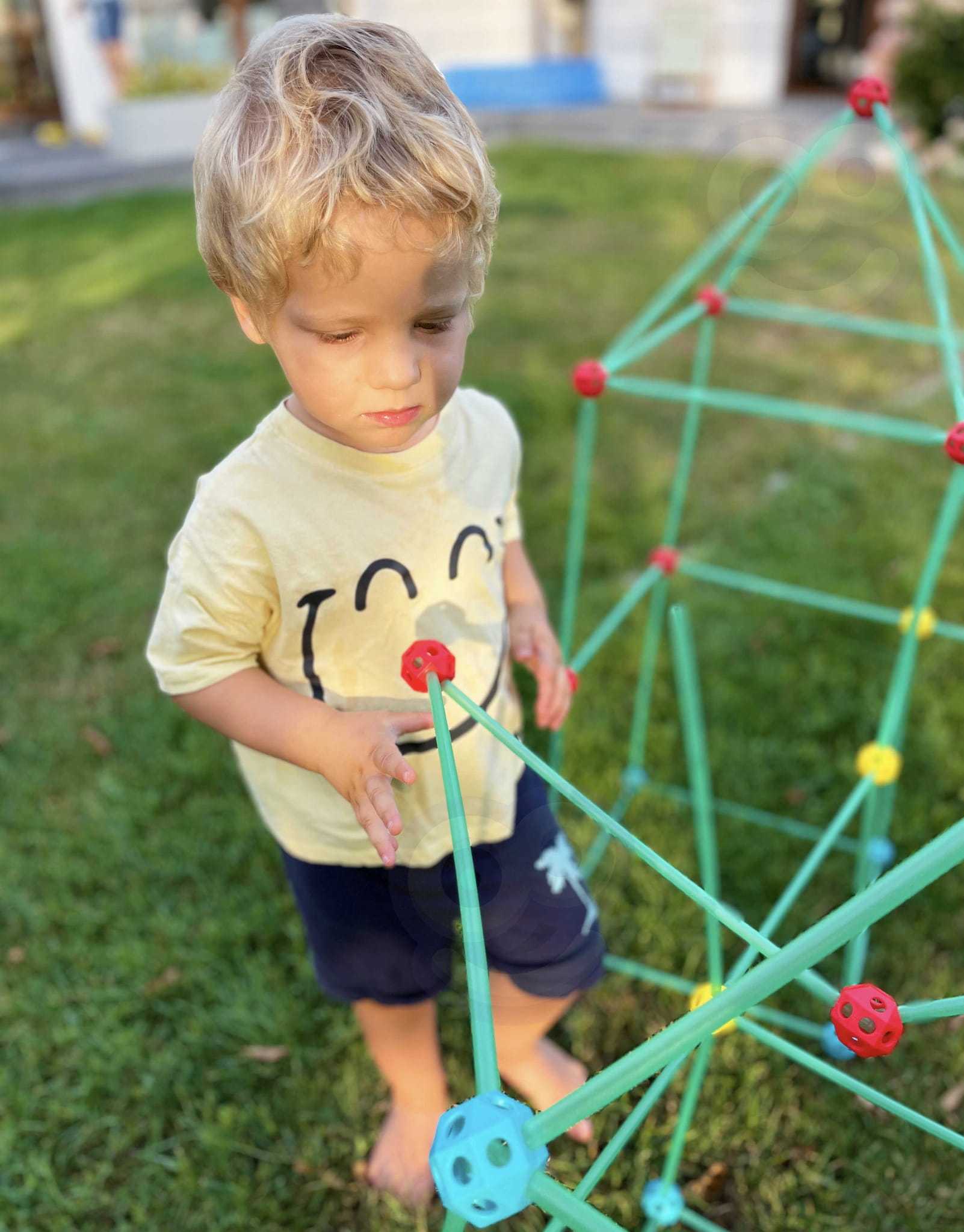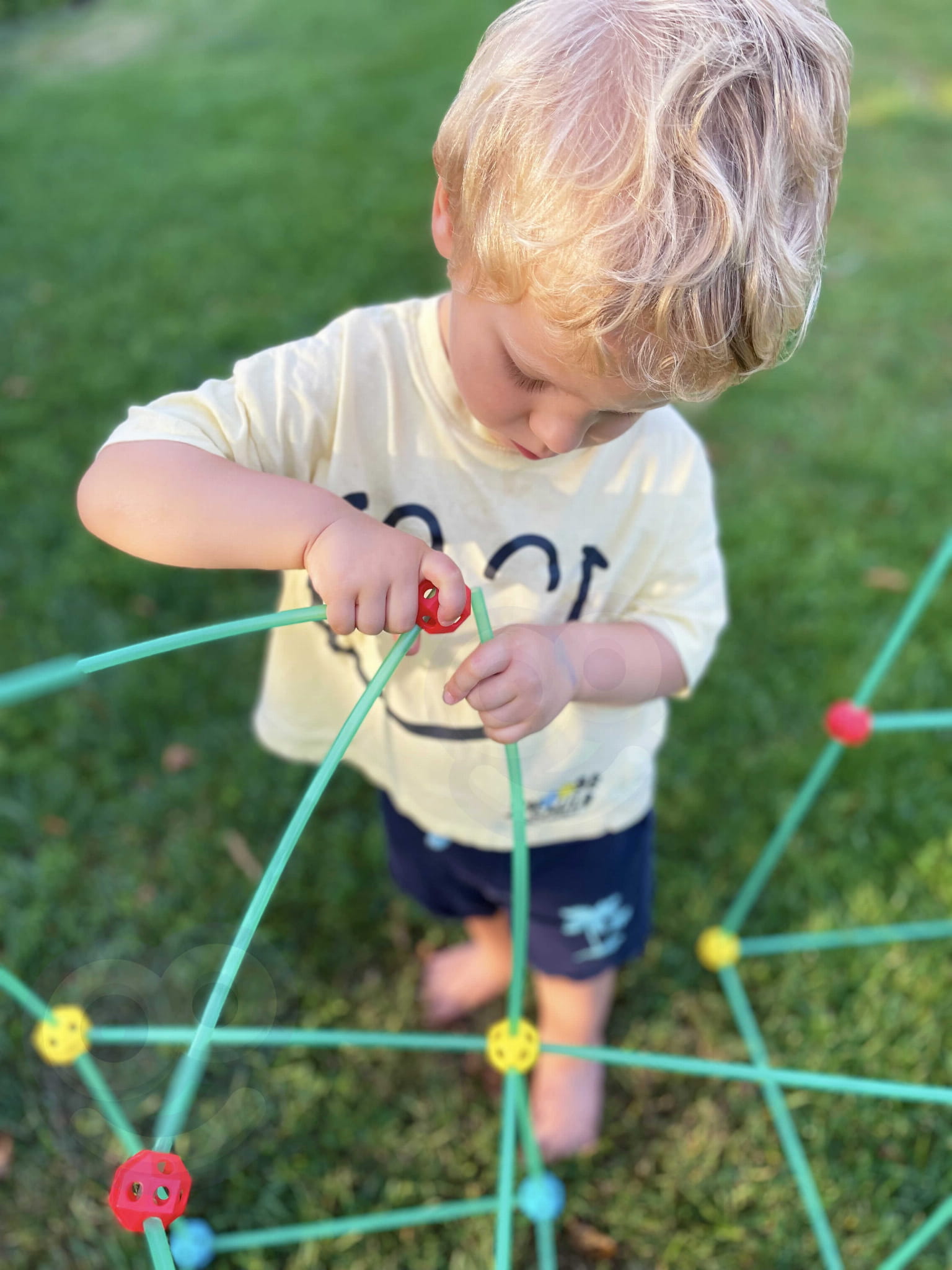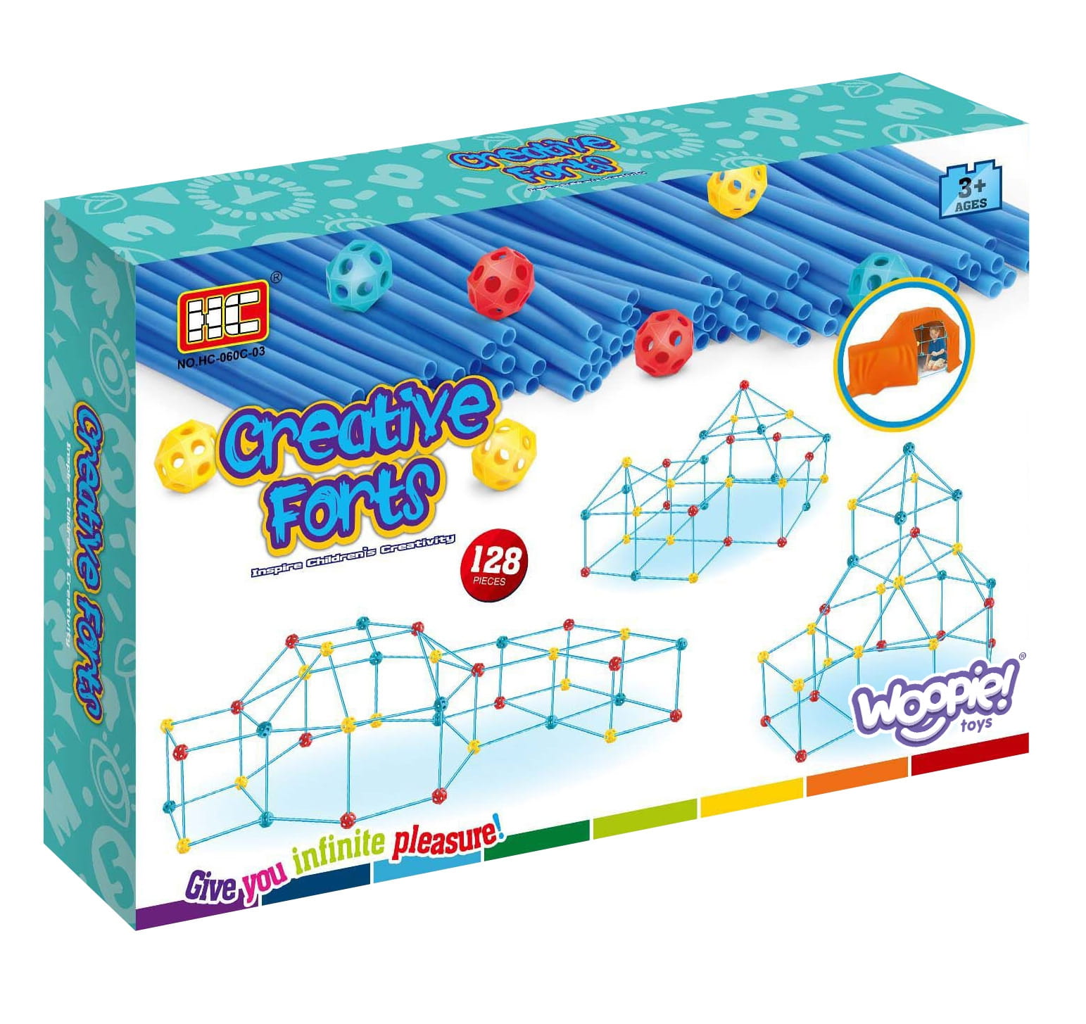 Kreatywny zestaw do budowy namiotów i tuneli – 128 elementów, w tym rurki, łączniki i materiał. Dla małych konstruktorów od 3 lat.