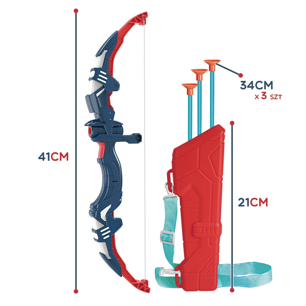 Wymiary produktu: łuk: 41(cm), strzały 34(cm), kołczan 21(cm)