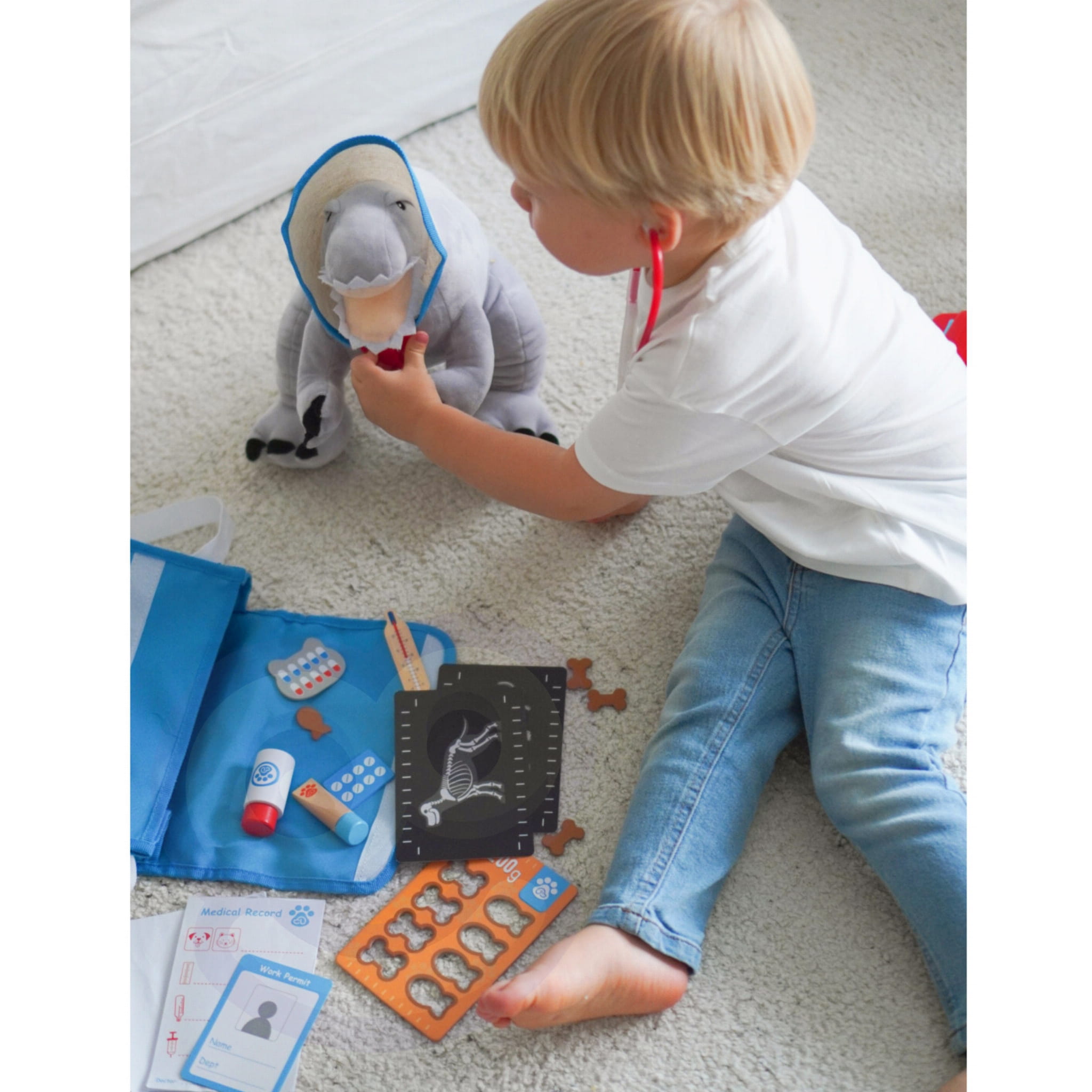 Tooky Toy zestaw weterynarza to świetna zabawka umożliwiająca wcielenie się w rolę prawdziwego weterynarza. Zabawa w lekarza uczy empatii oraz wrażliwości na odczucia innych. Opiekując się drugą istotą, często słabszą i mniejszą dziecko uczy się również odpowiedzialności. Jego bogate, wieloczęściowe wyposażenie i estetycznie wykonane przyrządy medyczne pobudzą wyobraźnie dziecka i w prosty sposób wytłumaczą dziecku, że weterynarze ratują życie zwierząt. Podaruj swojemu małemu miłośnikowi zwierząt wszystko czego potrzebuje, żeby zadbać o małego futrzanego przyjaciela.