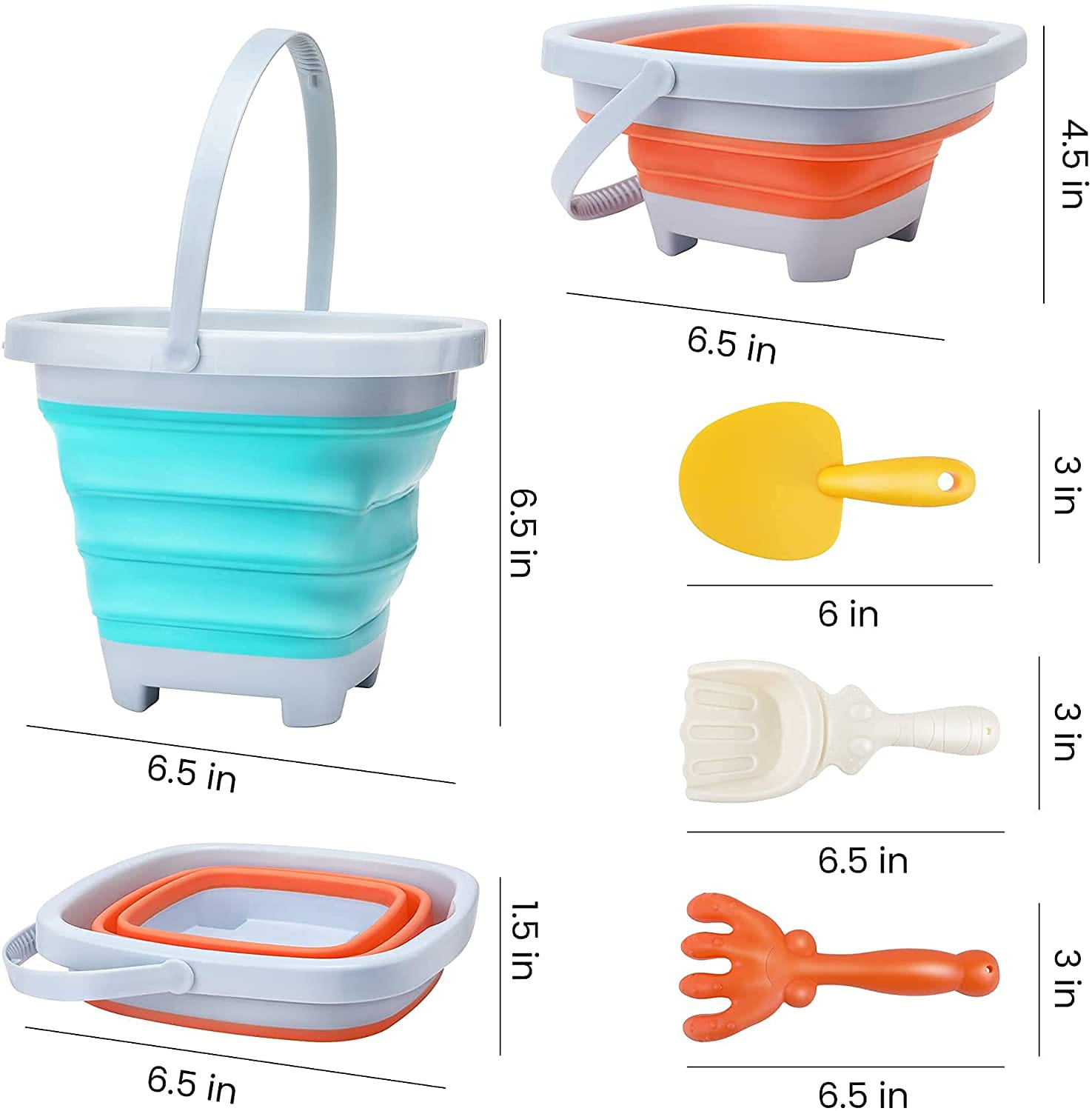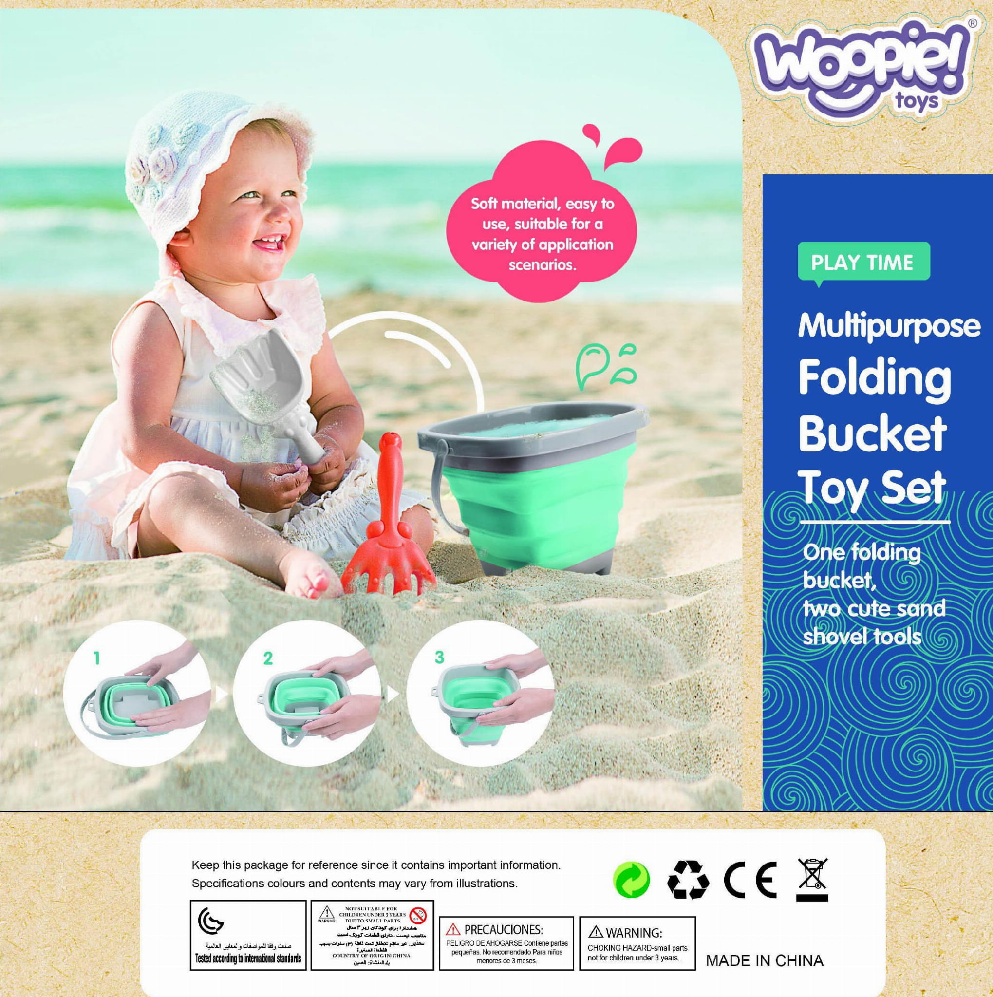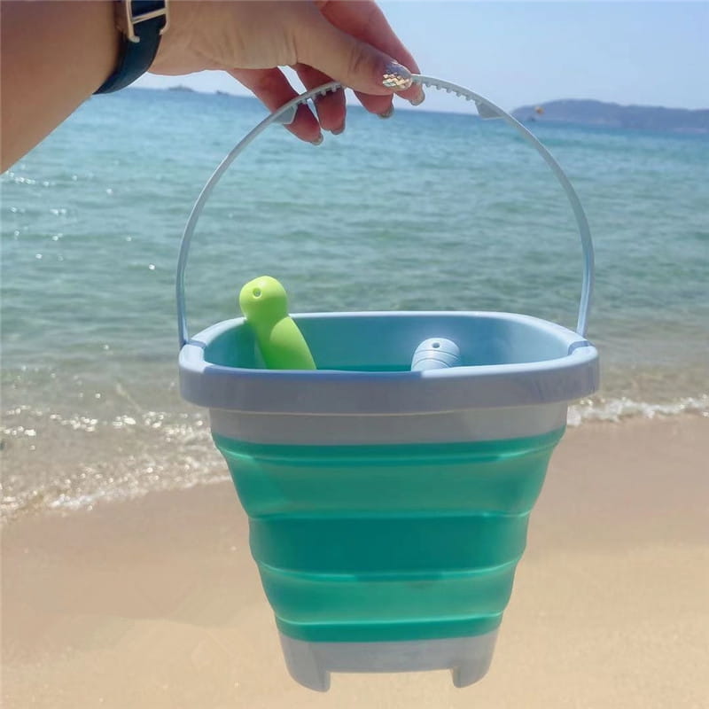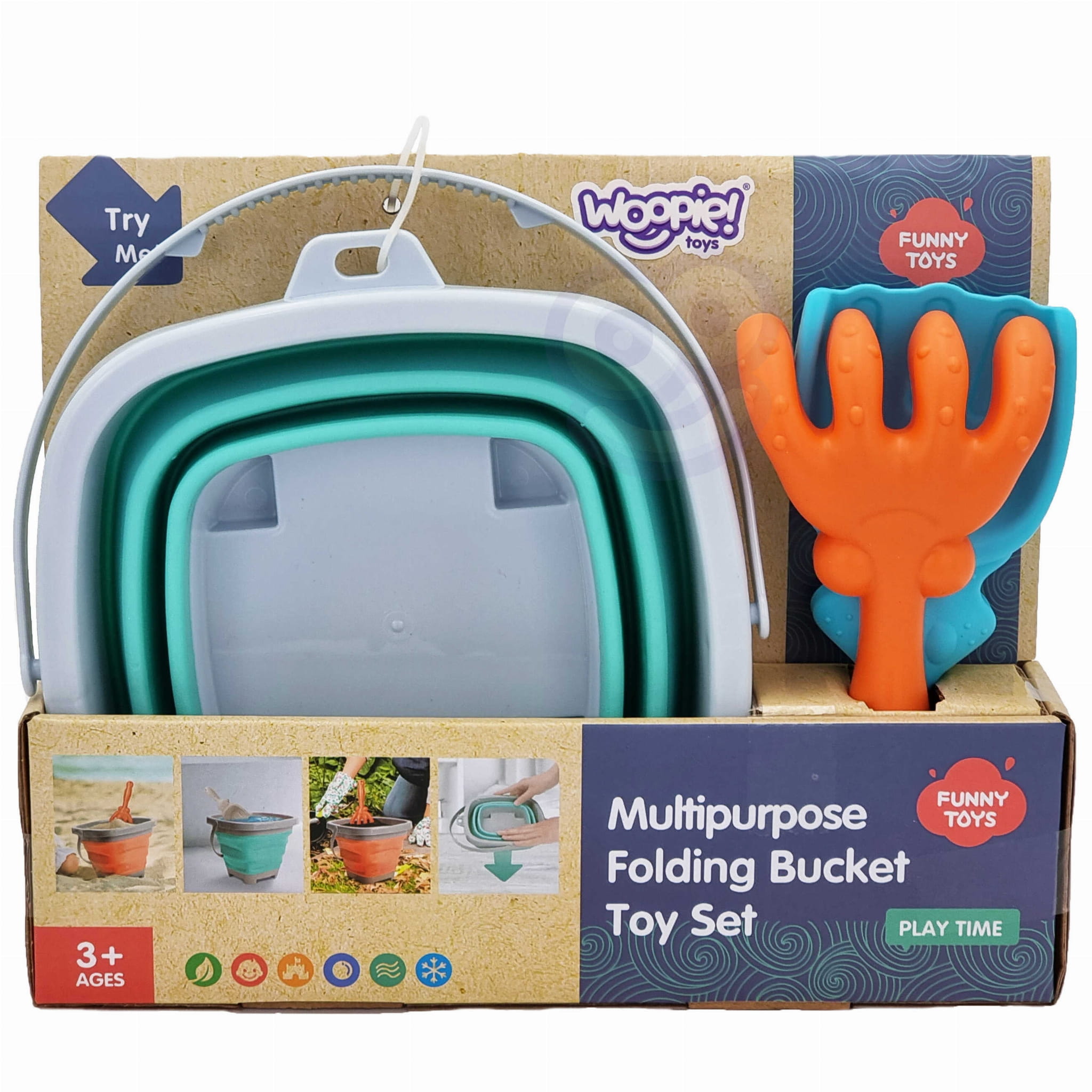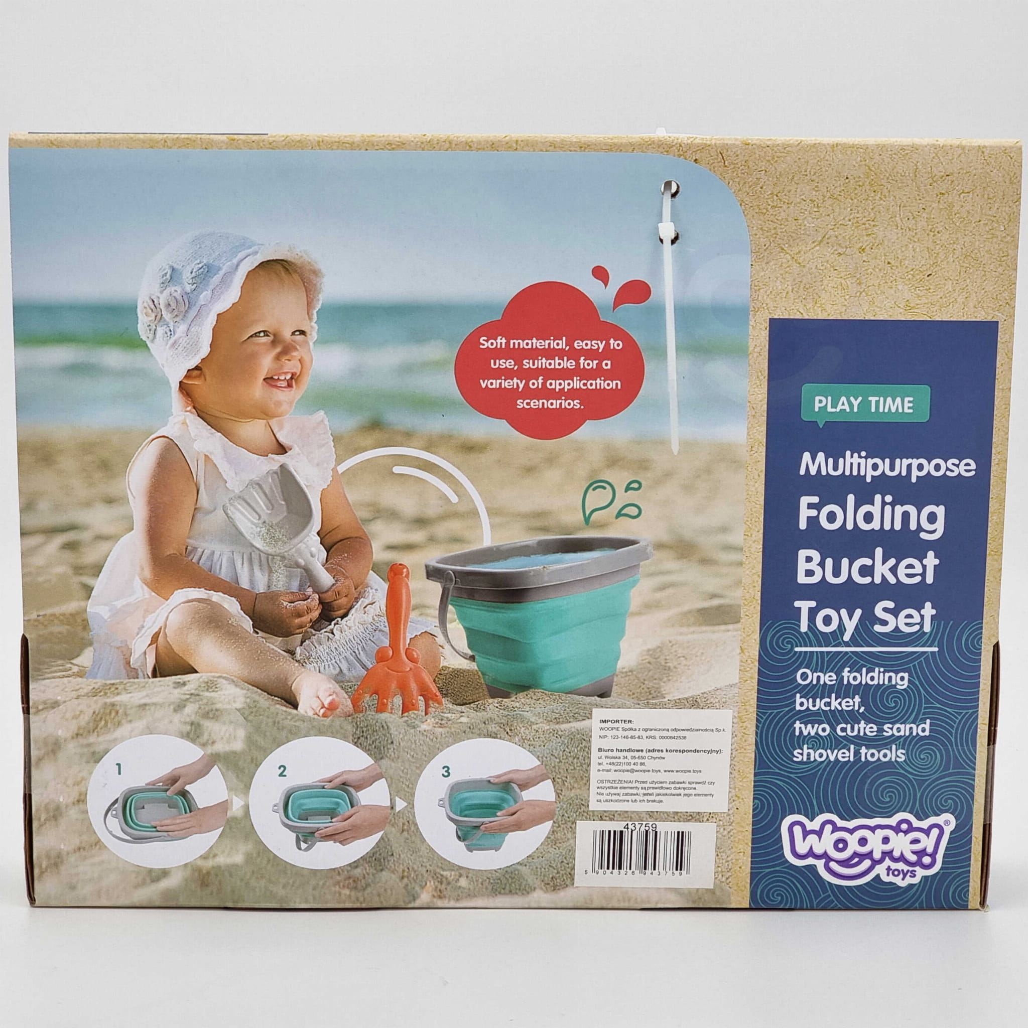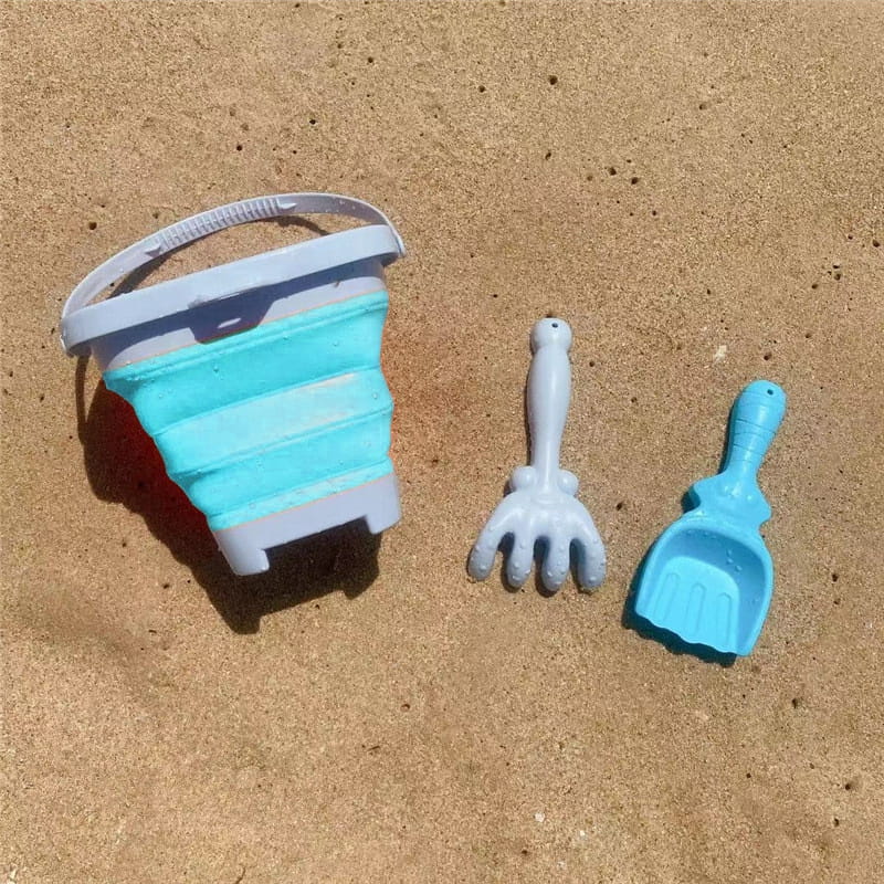 Składane silikonowe wiaderko WOOPIE z grabkami i łopatką to praktyczna i kreatywna zabawka do piasku dla dzieci od 3 roku życia, idealna na plażę, do piaskownicy i ogrodu.